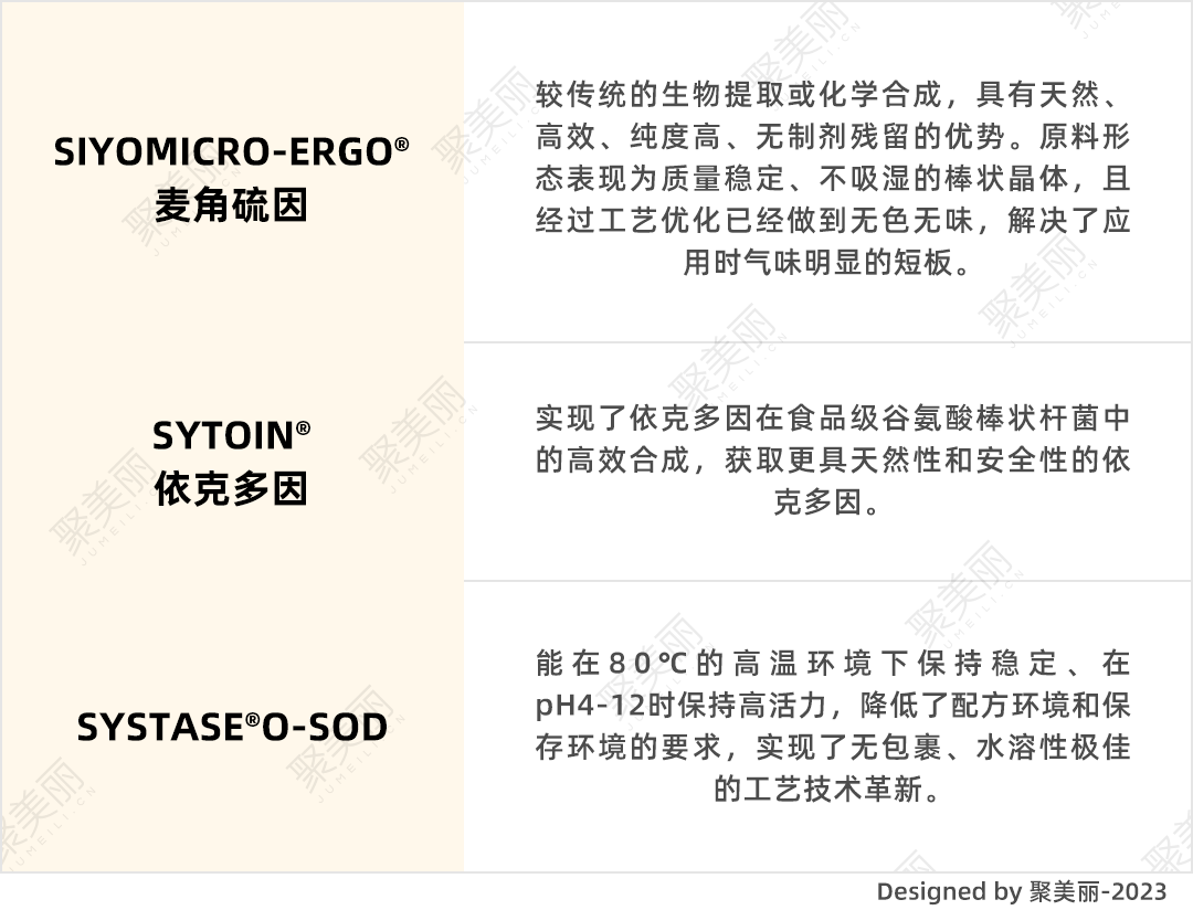 如十分“热闹”的重组胶原蛋白赛道,以该技术重现人体内胶原蛋白,相较于传统的动物来源提取型更为安全有效。还有像麦角硫因、依克多因等也借助合成生物学实现了原料优化,例如中科欣扬推出的三项原料。