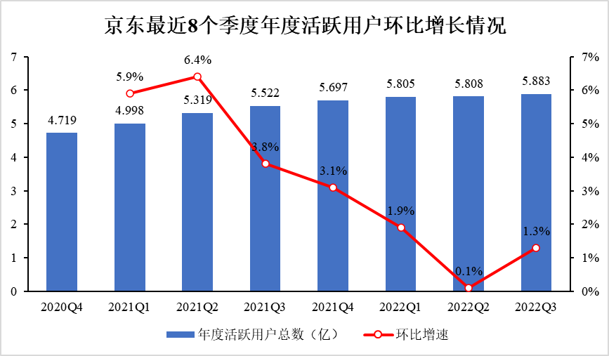 自2020年Q4以来的近8个季度,京东年度活跃用户环比净增人数分别为2790万、3210万、2030万、1750万、1080万、30万、750万。如下图所示,从2021年Q4开始,增速下降趋势明显,与社交电商京喜、社区团购业务京喜拼拼先后从下沉市场收缩、停止烧钱补贴有关。