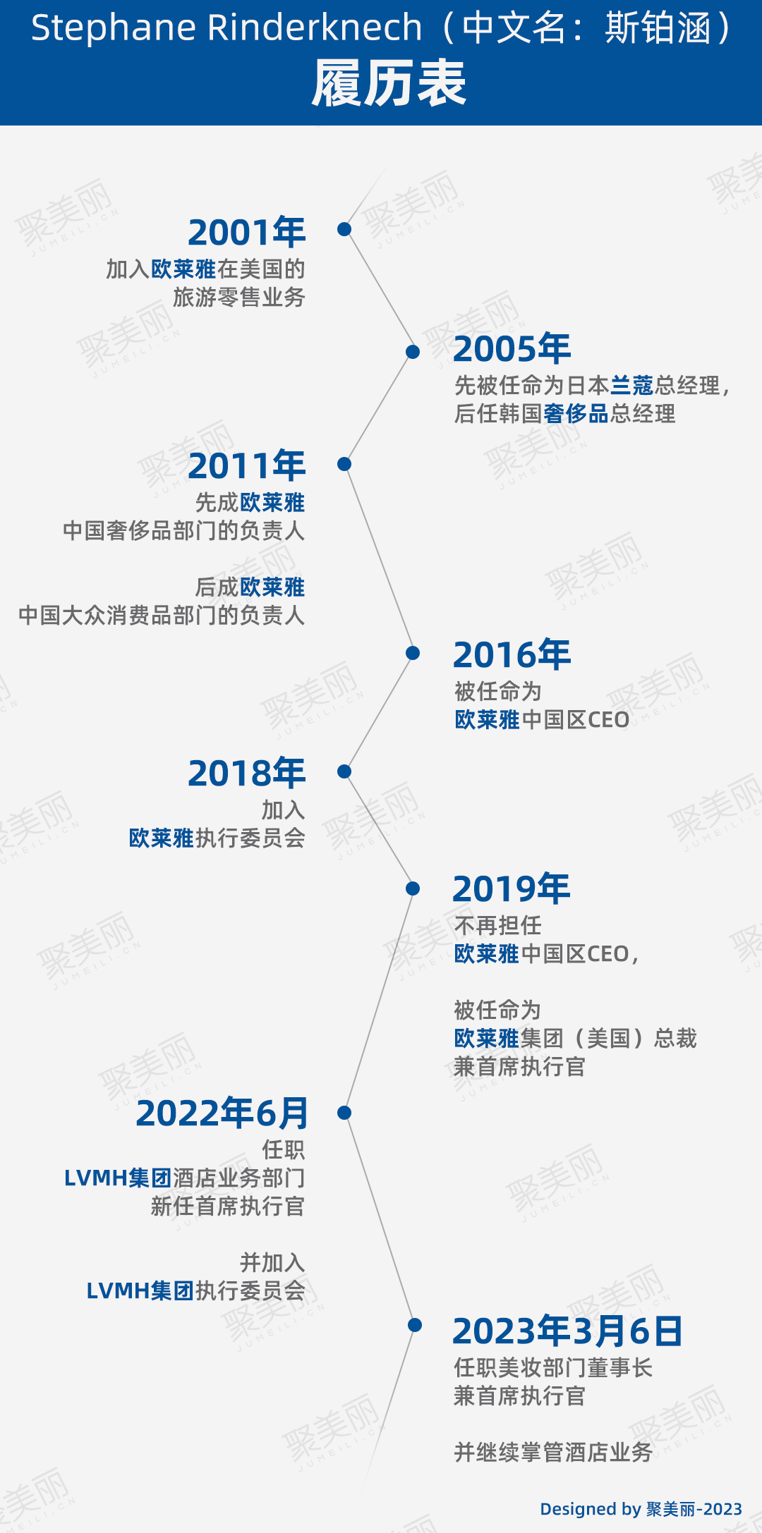 2023年3月6日,LVMH集团正式任命Stephane Rinderknech(中文名:斯铂涵)为美妆部门董事长兼首席执行官。