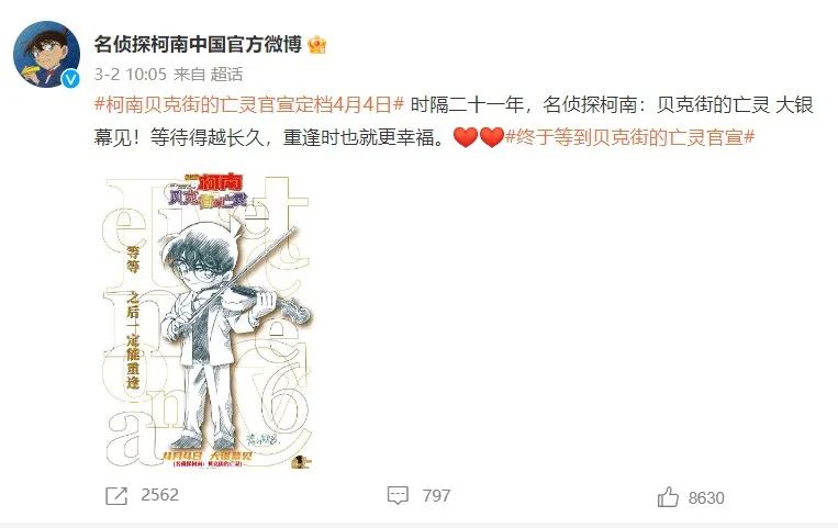 3月2日,《名侦探柯南》中国官博公布了《贝克街的亡灵》将于4月4日在内地上映的消息。值得注意的是,该作将在全国艺联专线上映。艺联专线是一种专门满足不同观影群体需求,对标国外艺术影院“分线放映”模式成立的放映联盟,也是大量普通观影者日常极少接触到的放映模式。选择这一模式到底会对粉丝观看《贝克街的亡灵》带来什么样的影响呢?