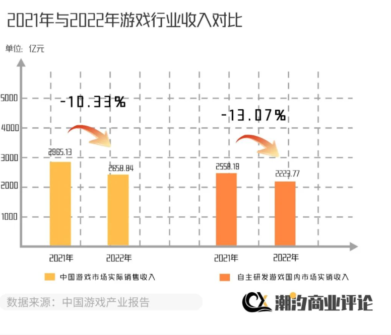 中国游戏产业报告显示,2022中国游戏市场实际销售收入为2658.84亿元,同比减少306.29亿元,下降10.33%。而自主研发游戏国内市场实销收入为2223.77亿元,同比下降了13.07%。