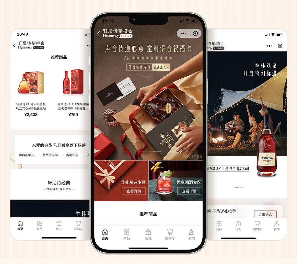 轩尼诗挚樽会作为品牌的CRM小程序于2021年8月创建,随后小程序中的轩尼诗积分体系于2022年9月正式开通,历经不断的完善与升级,轩尼诗挚樽会小程序承载了会员体系、品牌宣推、产品推荐等多方位的功能,如今伴随着3月1日的商城上线,轩尼诗旗下产品——轩尼诗X.O、轩尼诗詹姆士、轩尼诗V.S.O.P、轩尼诗X.X.O和轩尼诗新点的甄选干邑均可于小程序中的线上商城直接购买,为用户深入打造了更加完整和丰富的线上体验。