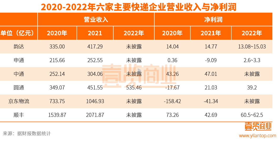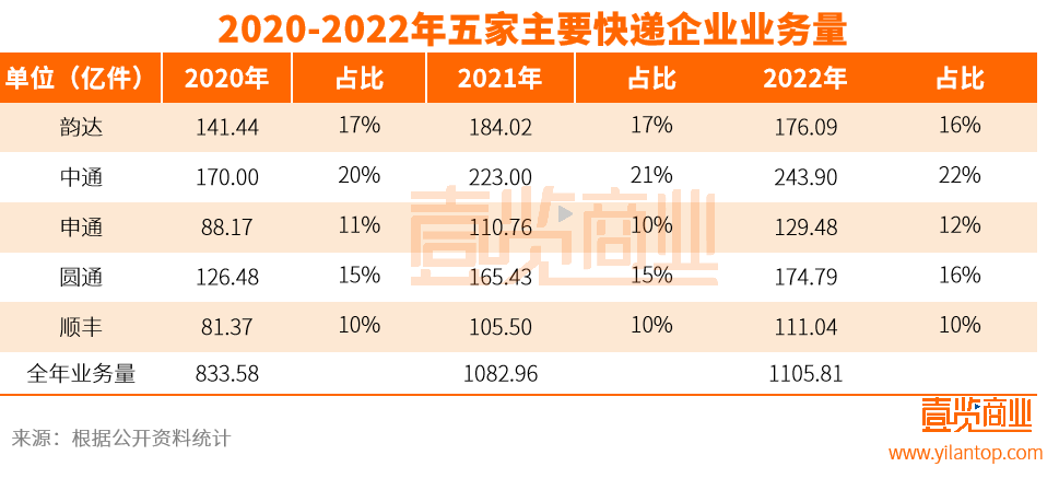此外,据韵达发布的2022年业绩预告,2022全年业务量176.09亿票,同比下降4.31%。净利润预计为13.08~15.03亿元之间,同比下降11.44%~同比增长1.76%。