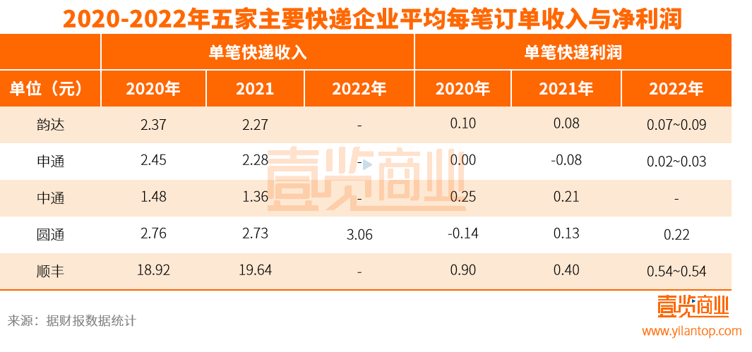 据公开数据显示,2013年我国快递行业的平均单价为15.69元,2020年已经降为10.55元。2021年,韵达、申通、中通、圆通的平均每笔订单收入相较于前一年下降了0.1元、0.17元、0.12元和0.03元。
