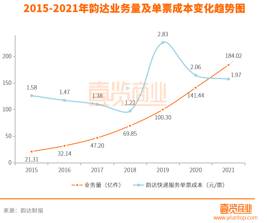 在多方作用下,快递的成本确实在下降。比如,韵达 2021年,快递服务单票成本是1.97元,而在2019年成本是2.83元。