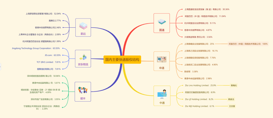 值得注意的是,菜鸟虽然在技术上给通达系快递带来了更多的突破,但同时也开始侵吞通达系。近年来,阿里不断投资通达系快递企业,目前,阿里已经是申通的第一大股东,中通、圆通的第二大股东,是韵达的第五大股东。