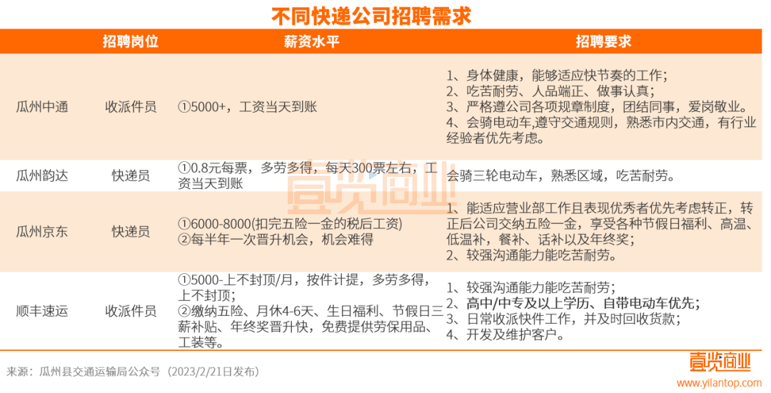 以甘肃省酒泉市瓜州县为例,该地同时发布的4家快递公司的招聘显示,京东和顺丰的招聘要求明显高于中通和韵达,当然待遇也更好。顺丰甚至对学历也有要求,需要是高中及以上。