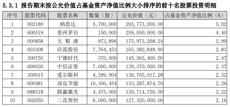 纳思达、贵州茅台、五粮液为前三大重仓股