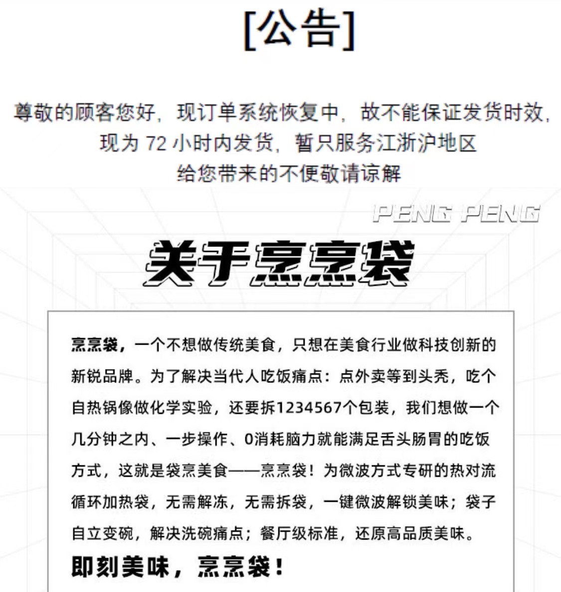 烹烹袋成立于2020年6月,所属公司为上海燥作食品贸易有限公司,主打以“微波加热、袋内即食”的速冻食品,包括意大利面、中式面、拌饭、炒饭和部分小吃。这些产品的卖点在于,从冰箱里拿出来无需解冻,也不用撕开包装,加热时间在3-6分钟左右,加热完成后使用膨胀起立的包装袋直接食用。