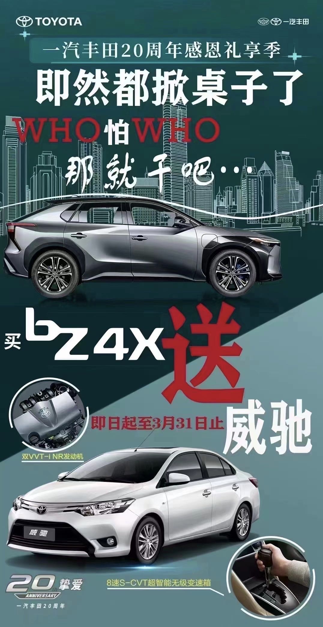 3月10日一家深圳一汽丰田经销商的宣传海报显示,该门店开展促销活动,购买电动车bZ4X即赠送紧凑型轿车威驰一辆。