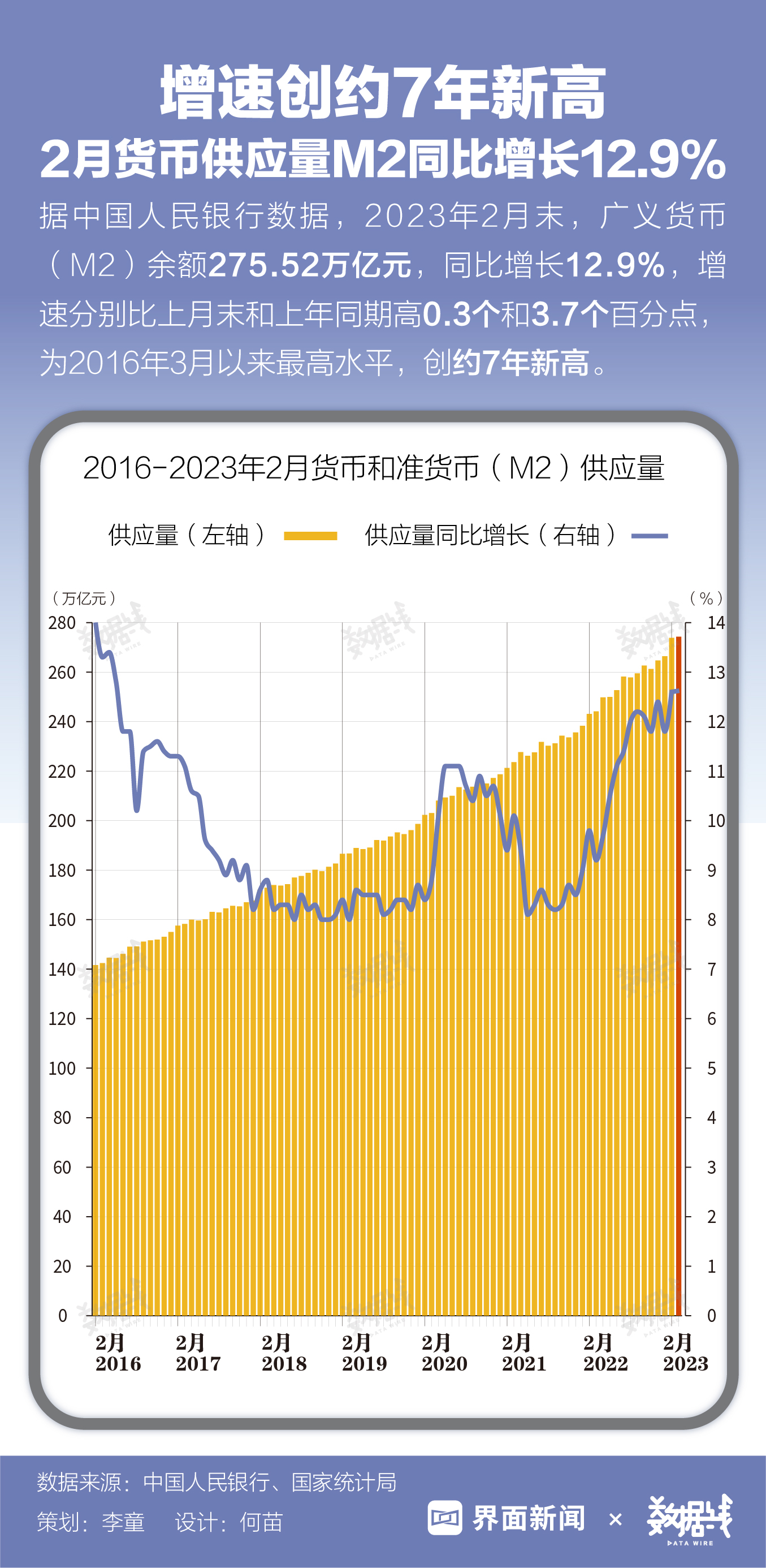 数据 | 增速创约7年新高,2月货币供应量M2同比增长12.9%