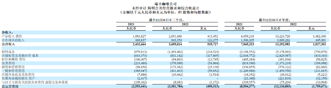 瑞幸的各项运营成本增加明显:材料成本同比大幅增加52%,至14.9亿元;房租及其他运营成本也增加了28%,至8.1亿元;运输费用则同比增加了62%,至3.8亿元;销售及营销费用大增74%,至1.7亿元。