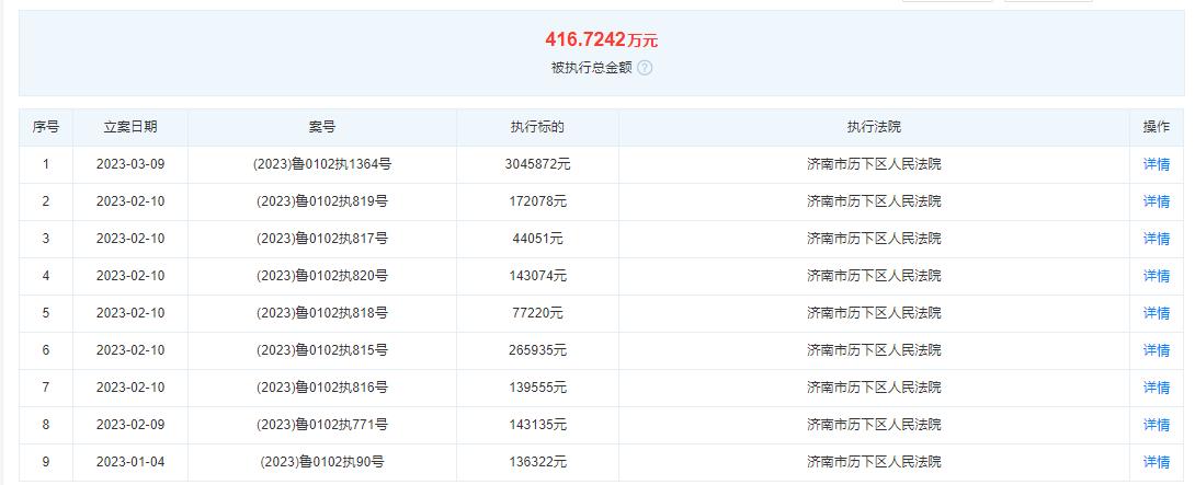 天眼查APP显示,截至目前,银座股份共9次被济南市历下区人民法院列为被执行人,累计被执行总金额达416.72万元。而作为历史被执行人,自2008年至今,银座股份共23次被法院强制执行,执行标的金额从500余元至23万余元不等。