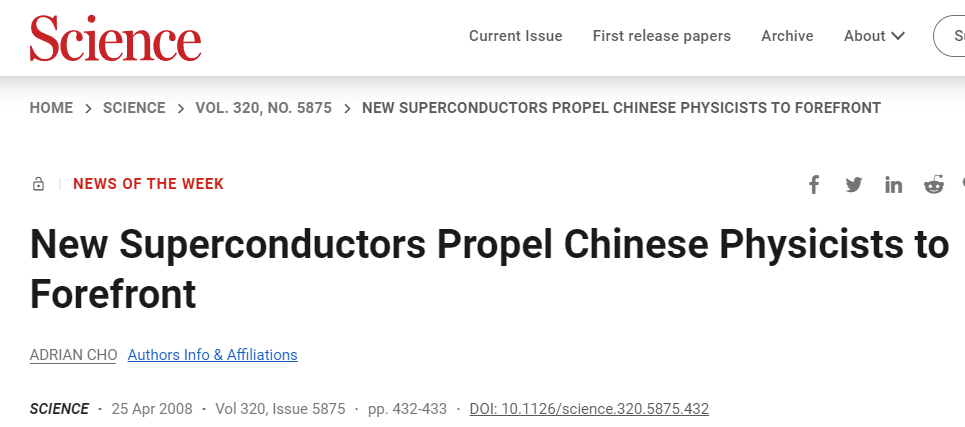 目前,美、日、中是全球超导领域的领先者。2008年,《科学》杂志就以“新超体把中国物理学家推向世界最前沿”为题,认为 “中国如洪流般不断涌现的研究结果,标志着在凝聚态物理领域,中国已经成为一个强国”。