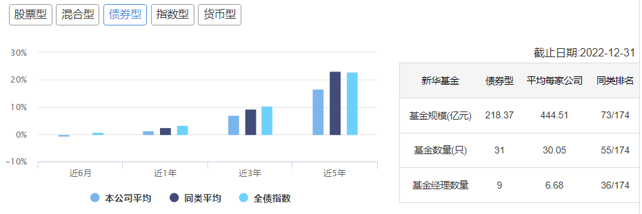 新华基金在2022年二季度末管理规模升至868.37亿元,也是成立至今规模最好的水平,此后基金规模连续两个季度回落。截至2022年末,新华基金管理规模仅575.8亿元,半年规模下降约292亿元,相比2021年底下降19.71%。尤其是债券型基金,截至2022年末,该类基金规模218.37亿元,在各类基金中下降幅度较高,同比下降16%,同类174家排名第73位。