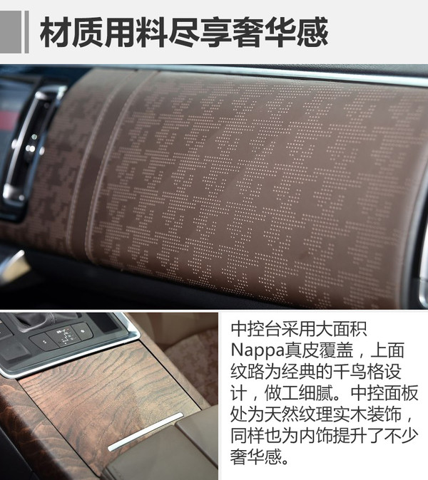 虽然内饰整体的风格没有太过浮华的设计,但车内多处细节则是用了上等的材质进行处理,为奢华感和品质感加分不少。中控台上采用大面积Nappa真皮覆盖,并进行了打孔处理,纹路则是选用既经典又复古的千鸟格设计。中控面板为天然纹理实木装饰,周围则用金属装饰条进行搭配。