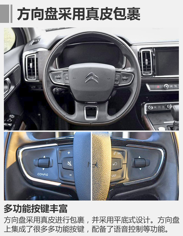 东风雪铁龙C6的方向盘采用真皮包裹,造型为平底式的设计风格,方向盘集成了多个多功能按键,但整体排列整齐并不乱。左侧为音量调节和多功能按键,右侧为蓝牙、语音控制等多功能按键。另外,新车配备了多达十项的行车安全的辅助系统,驾驶中更加人性化也更具有安全保障。