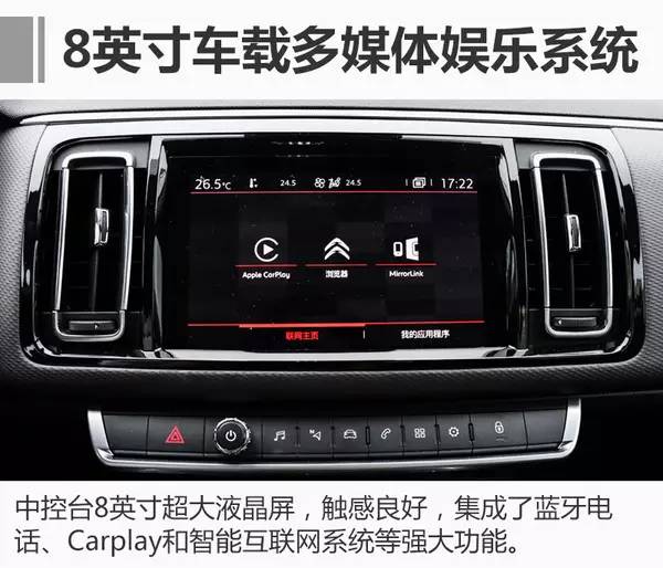 新车还配备了8英寸车载多媒体液晶屏,超大尺寸以及强大的多功能系统,同样为内饰增添了不少科技感的氛围。该系统自带Carplay、MirrorLink智能互联网系统、车载WiFi以及蓝牙和USB接口。屏幕下方也有部分实体按键,可方便快速进入功能菜单。
