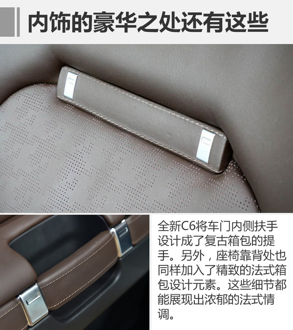 全新C6内饰的细节设计不仅仅只强调于奢华,还将法式浓郁的浪漫情怀融入每一处细节之中。设计师别出心裁的将车门内侧扶手以及座椅靠背设计成了奢华复古箱包提手的样式,并且也镶嵌了镀铬装饰进行搭配,将时尚元素与车内的设计相结合,凸显了法系车浓郁的法式浪漫情调。