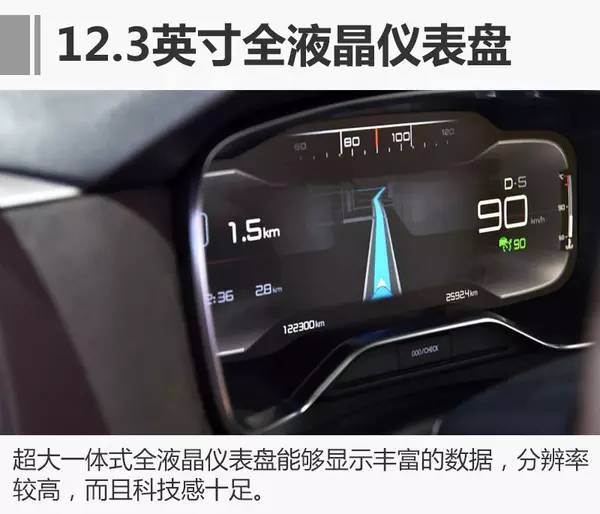 12.3英寸全液晶彩色仪表盘很值得称赞,提升了内饰的科技感,显示效果也十分清晰,中间位置显示当前时速,左中右的位置可自定义内容,包括多媒体、导航、驾驶辅助信息、行车信息等,可根据驾驶者的习惯进行调整。该仪表盘还拥有多界面模式可选,每一种模式都拥有不同风格的呈现效果,也使驾驶充满乐趣。