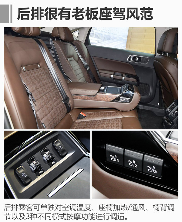 后排的设计很有老板座驾的风范,特意为后排乘客提供了可单独控制空调温度、椅背角度调节等操作方便的按键。除此之外,后排乘客还可享受3种不同模式的座椅按摩功能,每一种功能都有不同力度选择,这样的设计也十分贴心考虑到了后排乘客的感受,舒适度更是不言而喻。