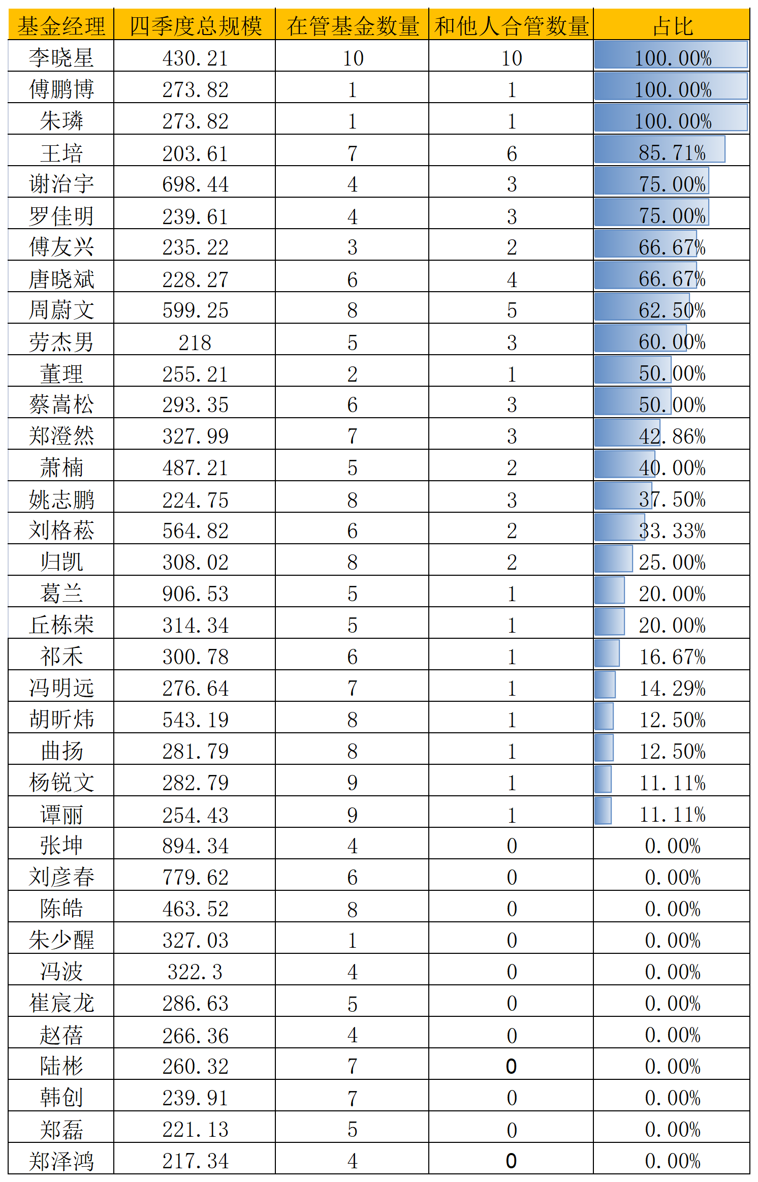 如果按照合管基金的占比来看,36位200亿以上基金经理中,有3位100%均和他人合计管理,包括李晓星、傅鹏博、朱璘。