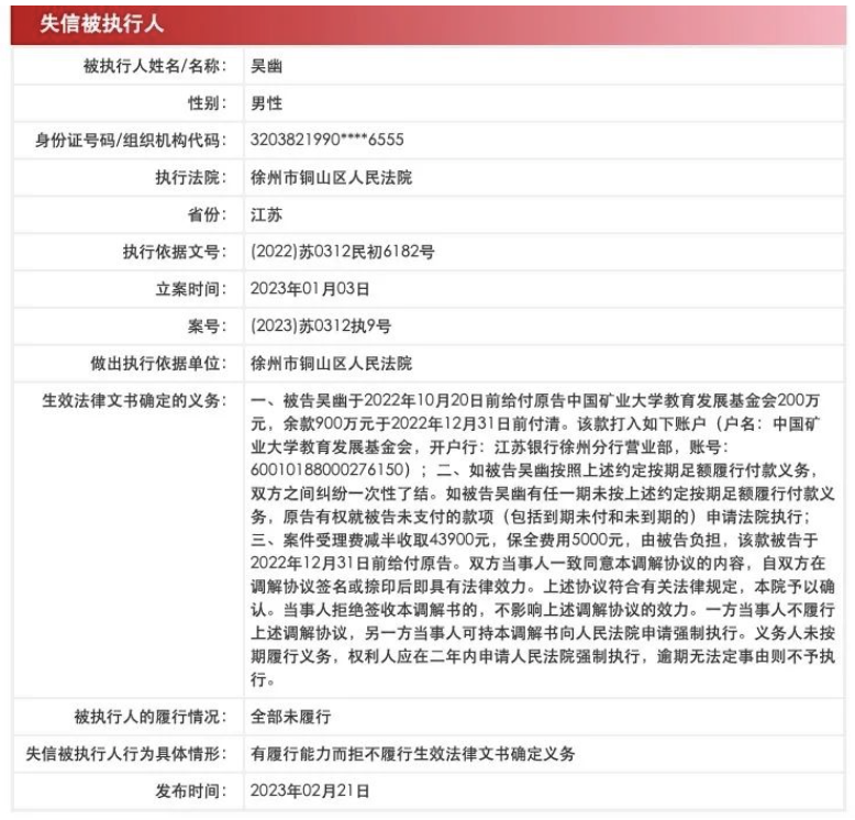 况且白纸黑字,矿大和学生这场官司,打的是赠与合同纠纷,最终法院将学生吴幽列为1100万余元的被执行人。