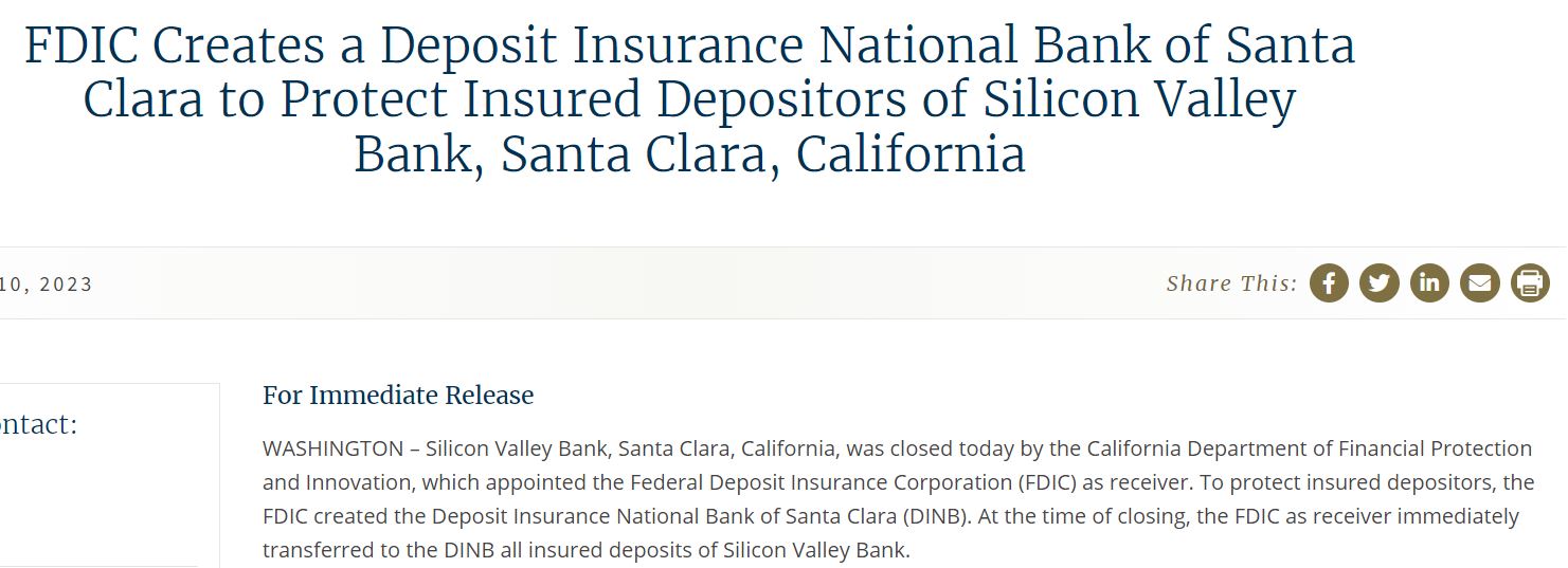 美国联邦存款保险公司(FDIC)周五发表的接管声明中指出,硅谷银行所有已投保的储户可以在13日早上之前提取已投保的存款。