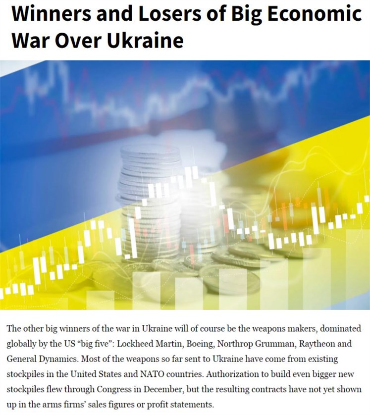 △“公平观察员”网站(fairobserver)报道:武器制造商是乌克兰战争的大赢家之一。在全球范围内由美国“五大”公司主导:洛克希德·马丁公司、波音公司、诺斯罗普·格鲁曼公司、雷神公司和通用动力公司。