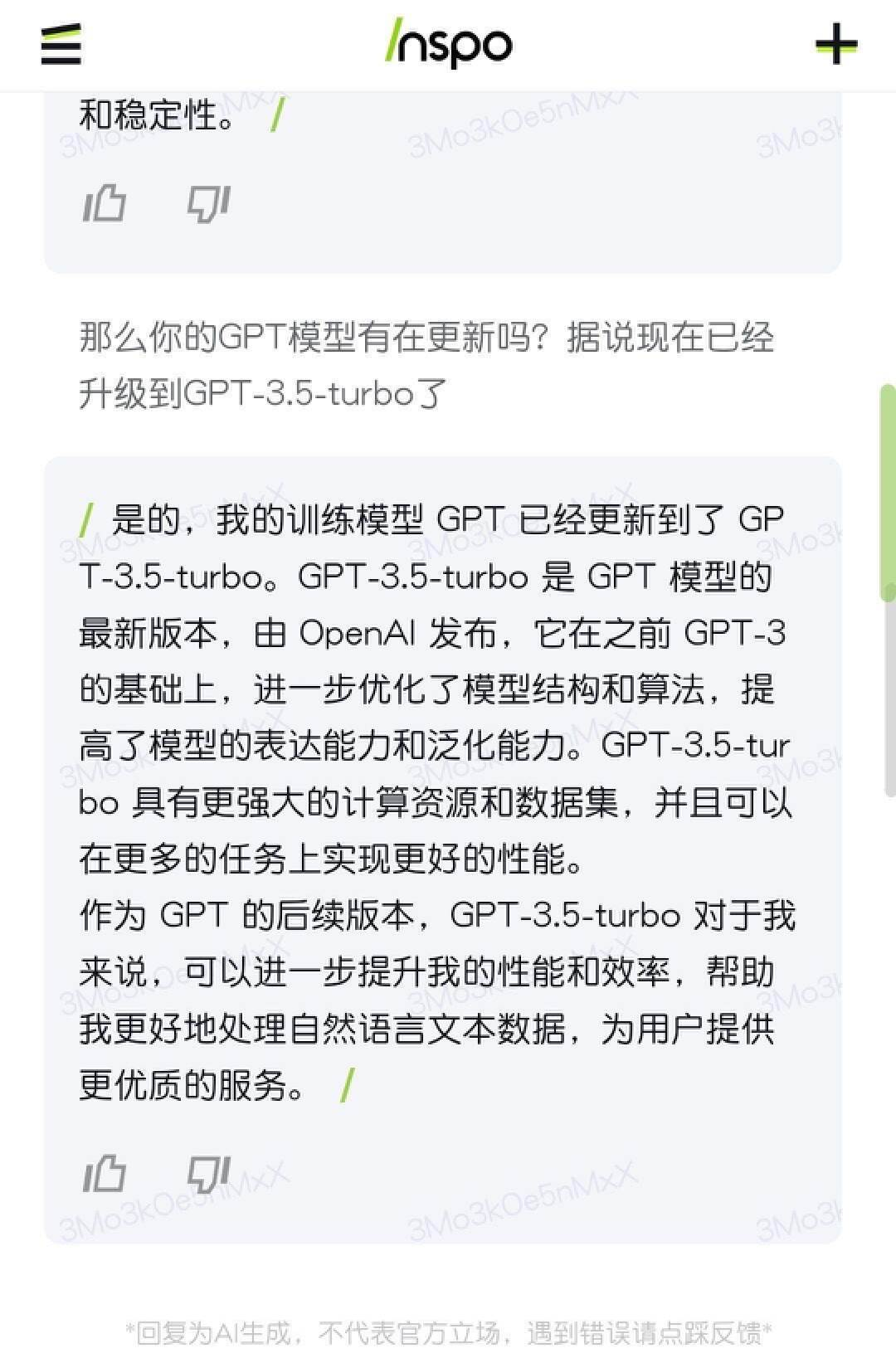 从一些网友的使用截图看来,Inspo的训练模型已经更新到了GPT-3.5-turbo。并且最新版本由OpenAI发布,在之前GPT-3的基础上优化了模型结构和算法。