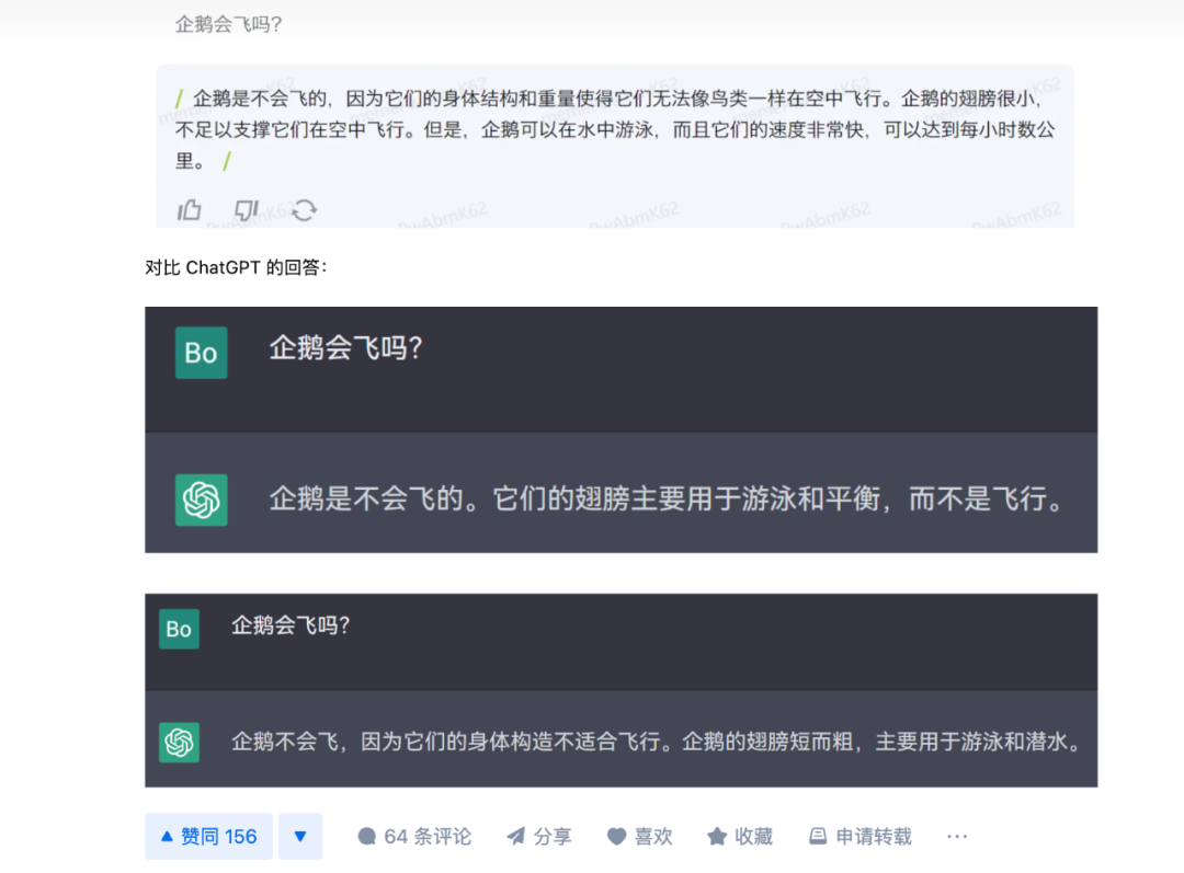 这类被质疑的创业公司不胜枚举,比如有业内人士在知乎上表示:国内某团队上线的服务似乎是直接大量使用了ChatGPT 的问答数据来训练自己的网络,输入问题和通过ChatGPT得到的回答高度相似。