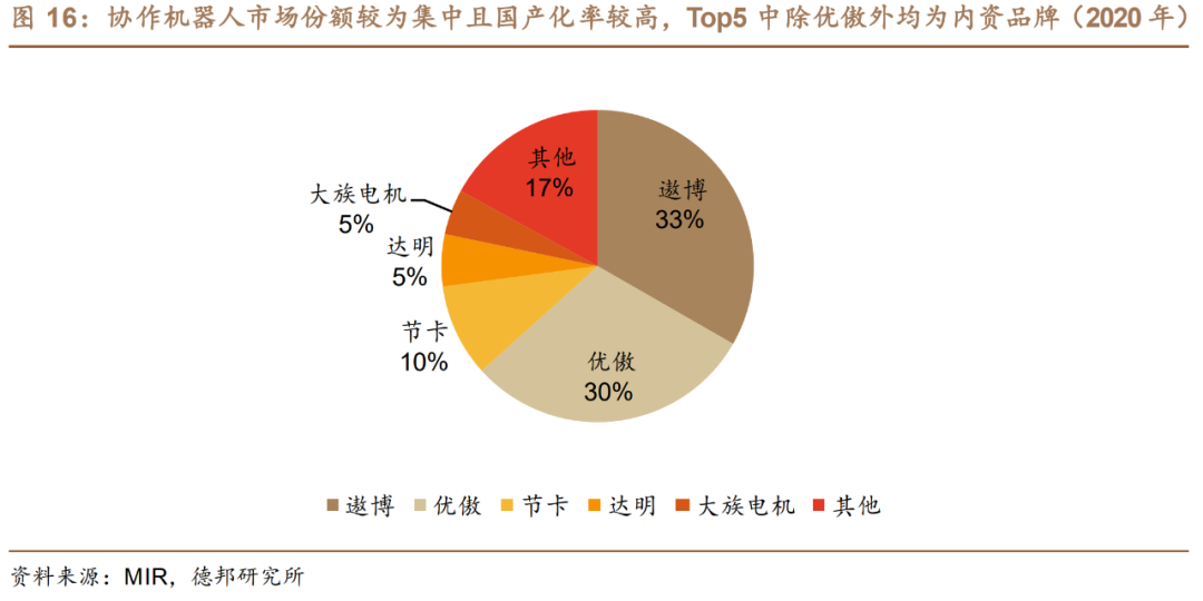 另据德邦证券数据显示,在市占率上,2020年除了外资品牌优傲以外,遨博、节卡分列国产品牌的第一和第二,共占据43%的市场。