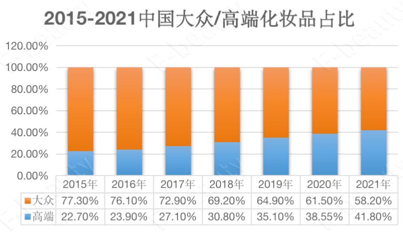 根据艾瑞咨询的数据,2016年至2020年,中国市场高端美妆的复合增长率高达26.37%,而同期大众美妆市场的复合增长率为13.9%。此消彼长之下,到2021年中国市场上高端化妆品的销售占比已经达到了41.8%。