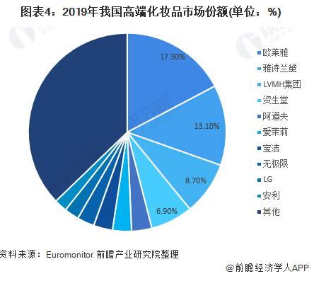 时间来到2019年,中国化妆品市场格局已经形成,高端市场竞争激烈且增速飞快。根据前瞻数据,2014—2019年,高端市场复合增速为16.98%,大众市场仅4.9%。且集中度较高,CR10公司的市场份额62.8%。