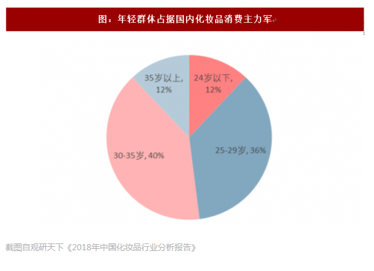 数据显示,2017年,我国25-35 岁群体化妆品消费占整体比例达 76%,35 岁以上群体占 12%。