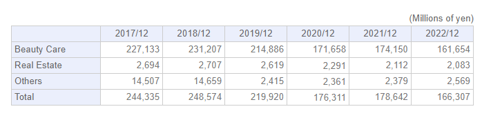 而美容护理部门作为其主要营收部门,近年来的盈利能力也一直处于下滑状态。官方财报显示,2017年,此部门净销售额为22.71亿日元(约合人民币1.16亿元),2022年则下滑为16.165亿日元(约合人民币8300万元),下滑28.82%。