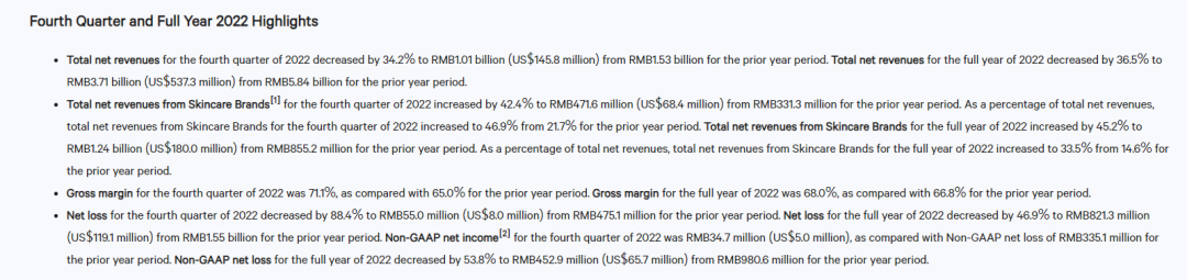 据财报显示,2022年全年总净收入为37.1亿元人民币(5.373亿美元),较去年同期的58.4亿元人民币下降36.5%,下滑的主要原因是彩妆品牌净收入下降,部分被护肤品品牌净收入增长所抵消。