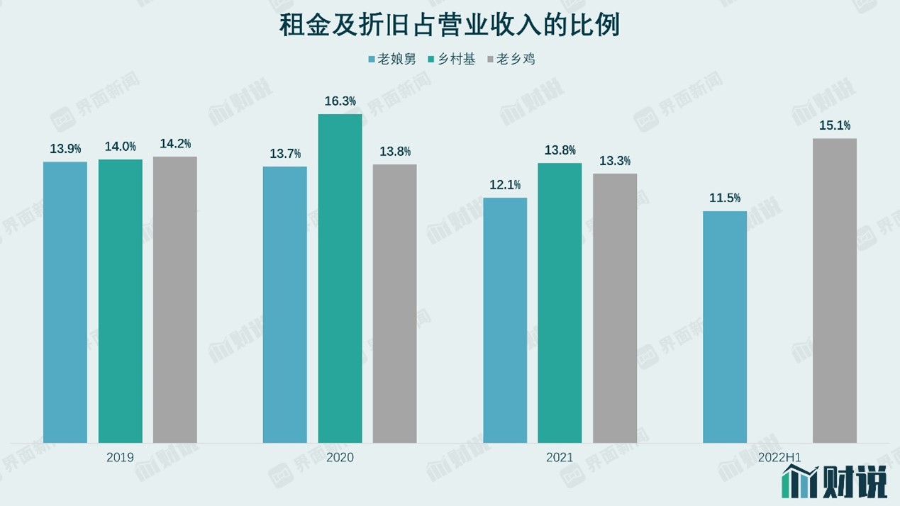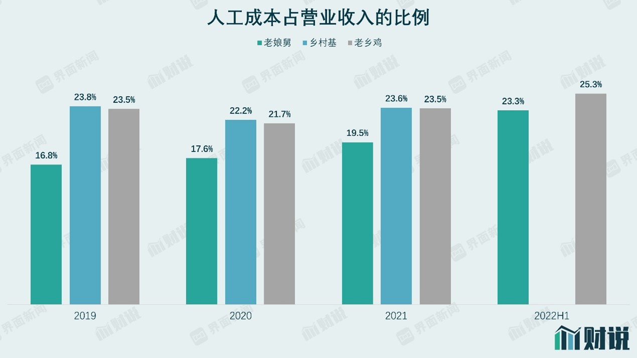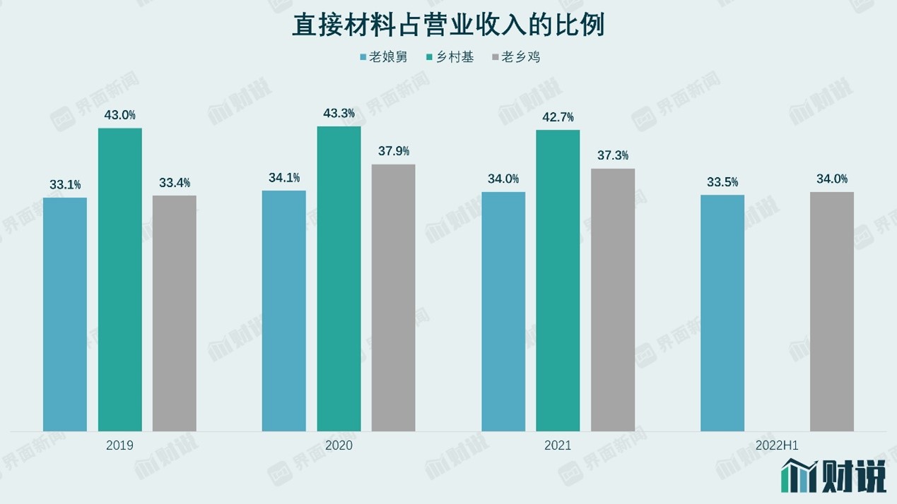 2019年到2022年中,老娘舅的直接材料成本占总收入的比例一直稳定在33%左右。老乡鸡和乡村基的业务和老娘舅类似,都属于中式快餐。以2021年数据为例,老乡鸡和乡村基的直接材料占收入的比例分别为37.3%和42.7%。