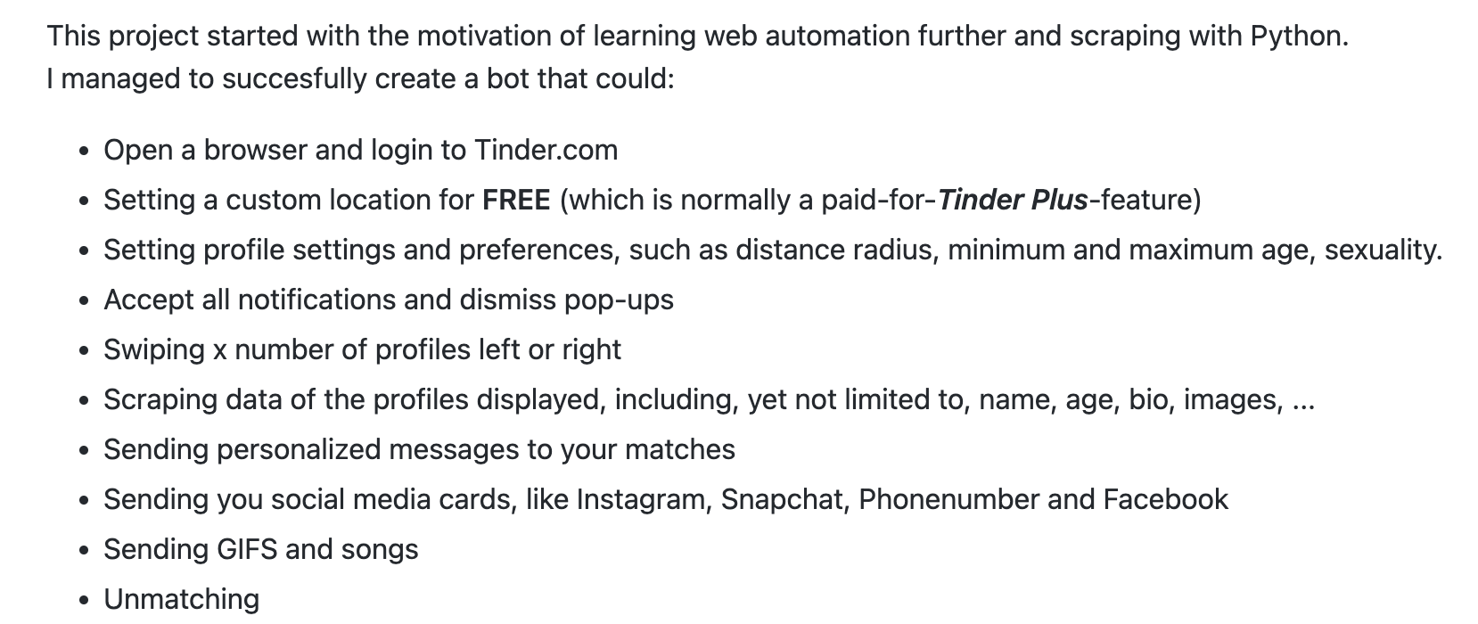 早在2021年,github上就有人发布了一个开源的tinder机器人代码,它能够为账号自动设置性别、爱好、自定义位置,按不同时间右滑(即“喜欢这个用户”,若双方均右滑了即可“配对”),甚至为配对的对象发送个性化的开场白句子。发布者称,他使用这个工具在24小时内获得了1000个配对,并且已经拥有3万多个配对。