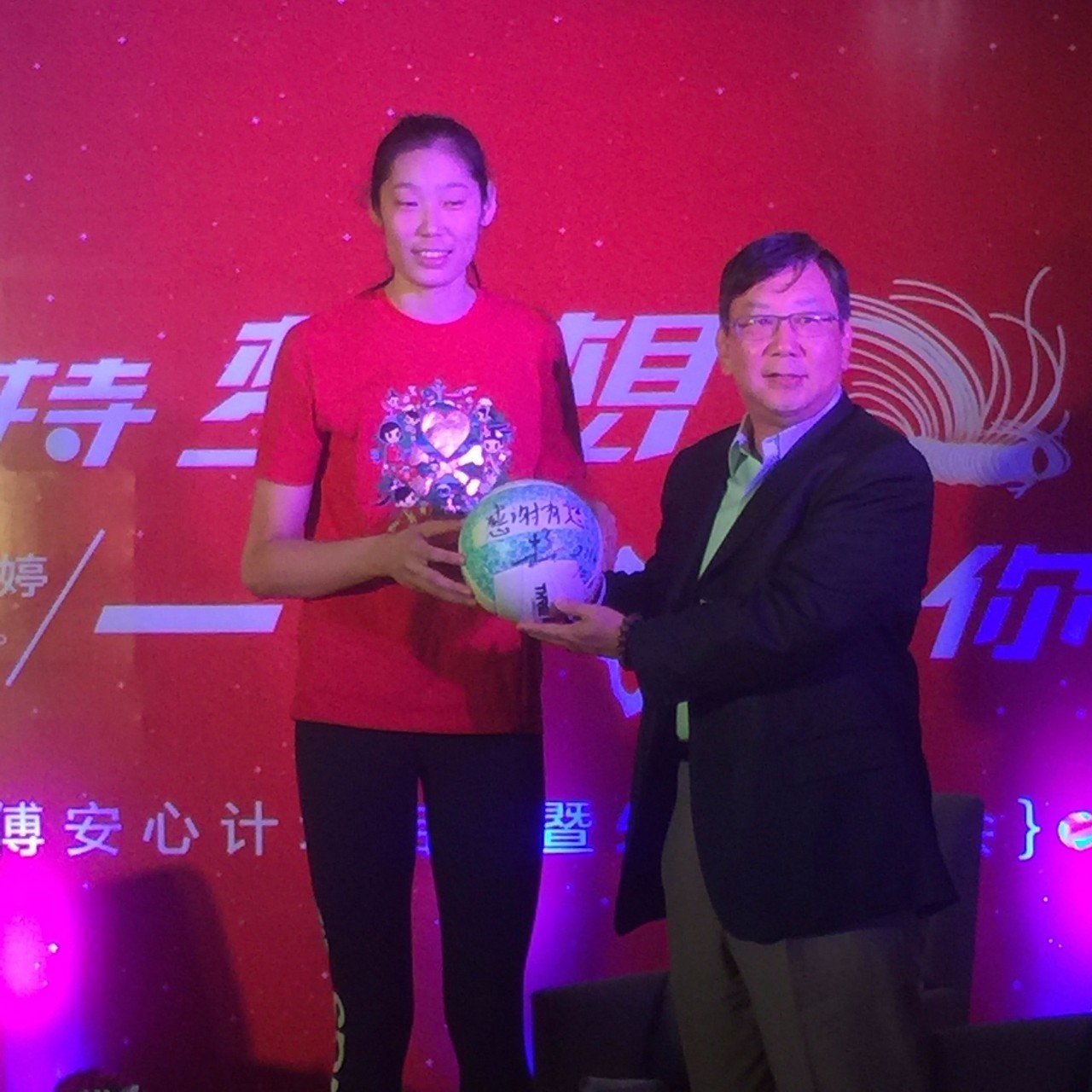 ▼朱婷在排球上写下“感谢有你”并将其曾送给康师傅