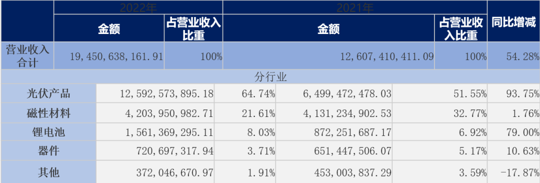 2022年,横店东磁光伏产业板块营收126亿,成为第一营收入来源。仅从营收规模上看,和千亿规模的第一军团相比,并不算大。