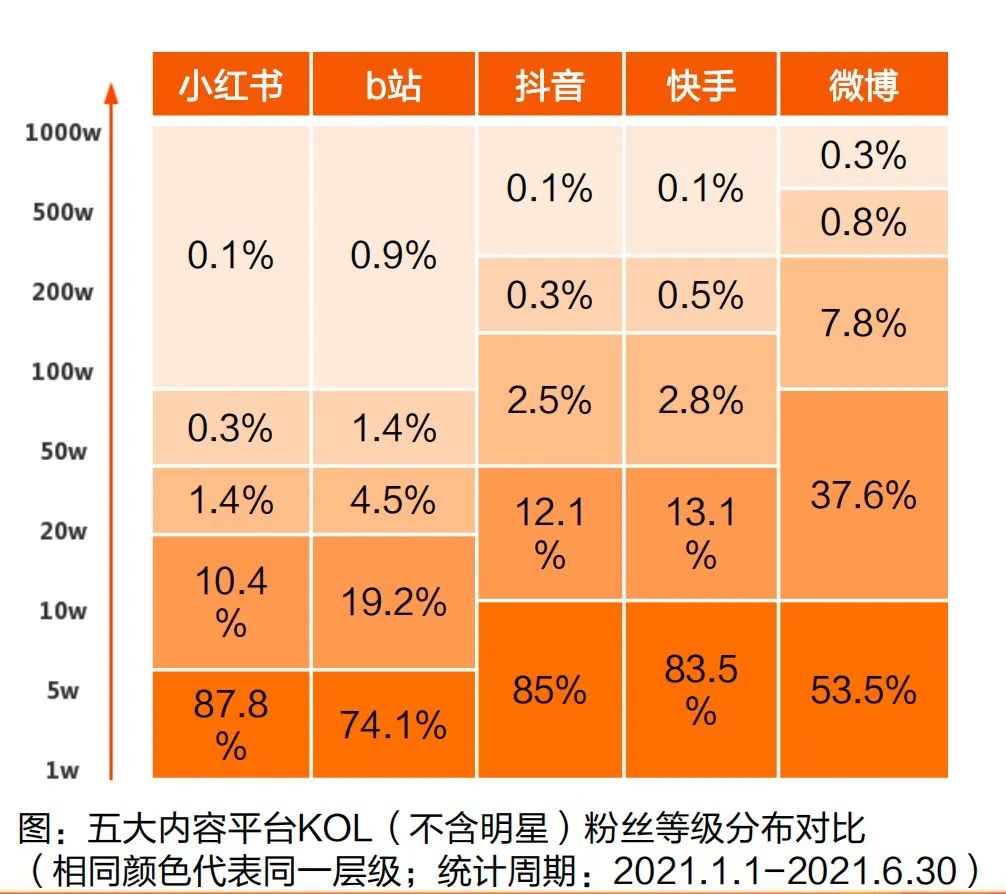 在小红书上,87.8%的用户是5w粉丝一下的群体,100~1000W粉丝的KOL(不含明星)仅占到了0.1%,对比同样推崇去中心化的抖音,100~1000w粉丝的KOL(不含明星)大约占到了0.5%~2.0%的区间。