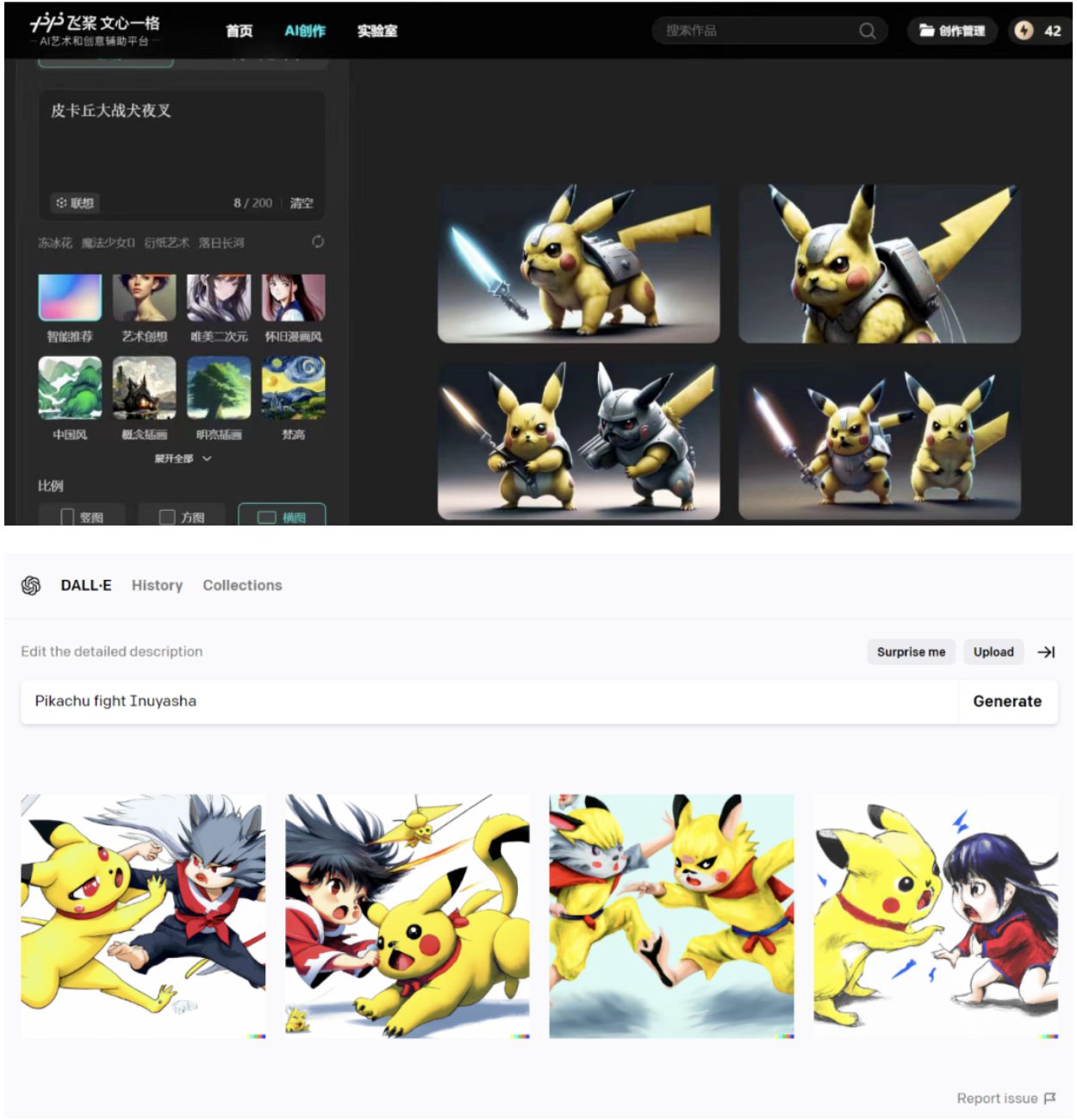 巨潮记者尝试着分别在文心一格和OpenAI旗下的DALLE网站上分别输出“皮卡丘大战犬夜叉”,得到的图片结果显示,文心一格生成的图片中并未包含犬夜叉的影像。显然其对于中文语义的理解仍然存在着一定的问题。