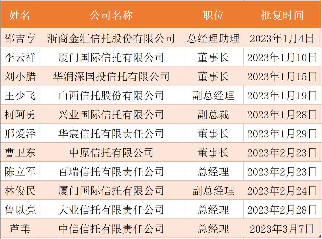 除了董事长、总经理职位的变更,山西信托、兴业信托、厦门信托都有新副总到任,浙商金汇信托迎来新任总经理助理。