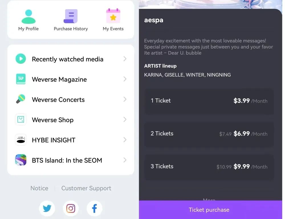 尽管明知道是发给所有付费粉丝的,但会员用户仍有一种“私人订制”的错觉,增加了粉丝与偶像的亲近感。不过,要购买会员还必须下载另一个名为“Weverse Shop”的应用,也顺势锁定核心用户,专门用于出售各类周边、票务、付费直播等内容。