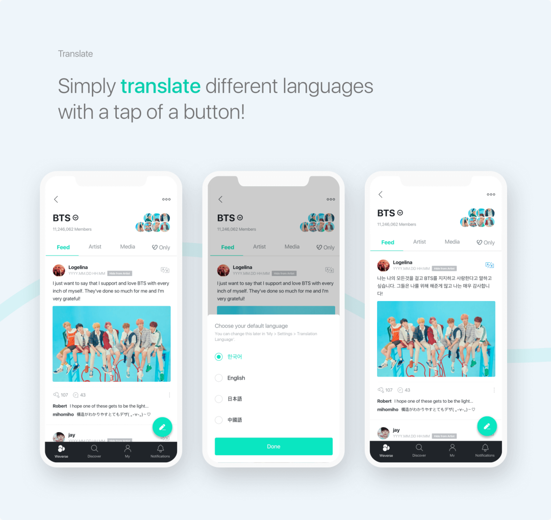进入应用后,可以看到界面非常简单,类似于Instagram,通过订阅偶像的频道,粉丝就能关注到偶像发的图文内容;而基于平台内的翻译工具,站内内容可以翻译成十几种语言,满足全球粉丝的阅读需求。据介绍,Weverse的用户已经遍布200多个国家,其中韩语用户只占10%左右。