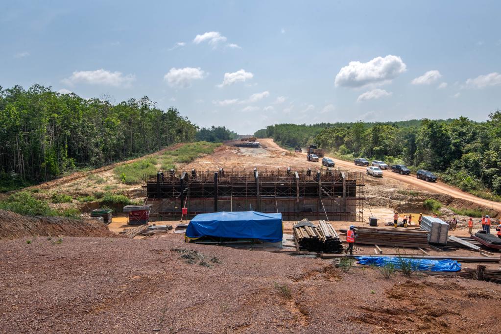这是2022年7月25日在马来西亚彭亨州淡马鲁县拍摄的建设中的马东铁项目30号桥(无人机照片)。新华社记者朱炜摄