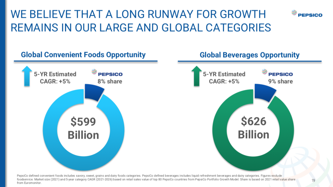 根据会议演示资料,方便食品和饮料2021年的全球市场规模分别达到5990亿美元和6260亿美元,并且预计2021-2026年的年复合增长率为5%。欧睿数据显示,按零售总额计算,百事公司在方便食品和饮料这两个品类中的全球市场份额分别为8%和9%。