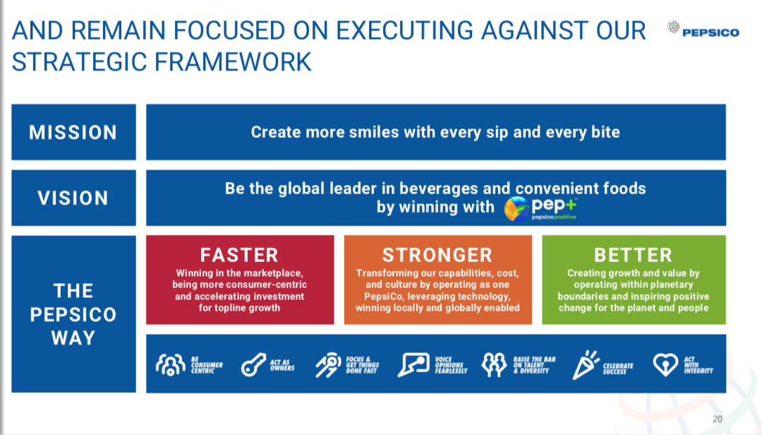 谈及未来愿景,龙嘉德在会上表示,百事公司将坚持其战略,这也是其过去4年来里一直在做的事情——“围绕着pep+,确保我们每天都通过食品和饮料来创造更多微笑,确保我们成为一家更快、更强、更好的公司。”