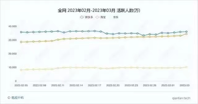 至于什么时候才能让消费复苏到疫情前?据易观千帆的数据显示,淘宝、京东、拼多多三家平台近30日的日活数据如下图,即使是在三八大促期间,三个平台的日活数据也不高,甚至不是30内活跃度的最高点。